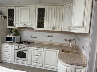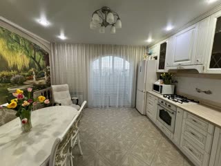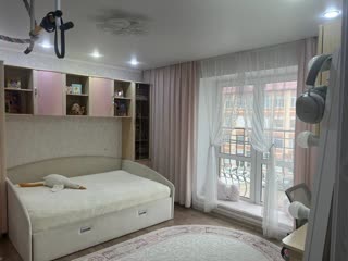 просторная кухня 15 кв. И с выходом на остекленную лоджию включает в себя встроенный гарнитур с техникой. Гостинная , где остается шкаф стенка , детская комната и взрослая спальни имеют витражные окна и